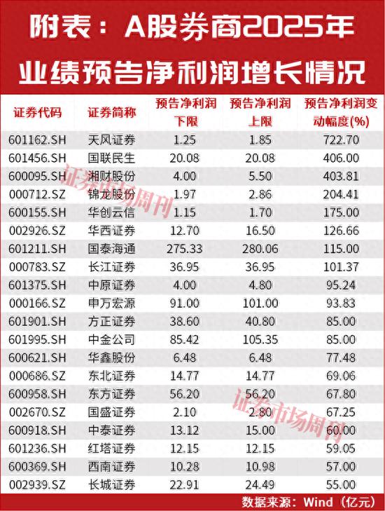 已披露业绩情况的29家券商中,6家券商增幅超过100%,19家增幅超过50%。如中信证券预计2025年归属于母公司股东的净利润300.51亿元,继续领跑;天风证券(601162.SH)预计2025年归母净利润1.25亿元-1.85亿元,扭亏为盈;国联民生(601456.SH)预计2025年实现归母净利润20.08亿元,同比增长406%;湘财股份(600095.SH)预计2025年实现归母净利润4亿元—5.5亿元,同比增长266.41%—403.81%。