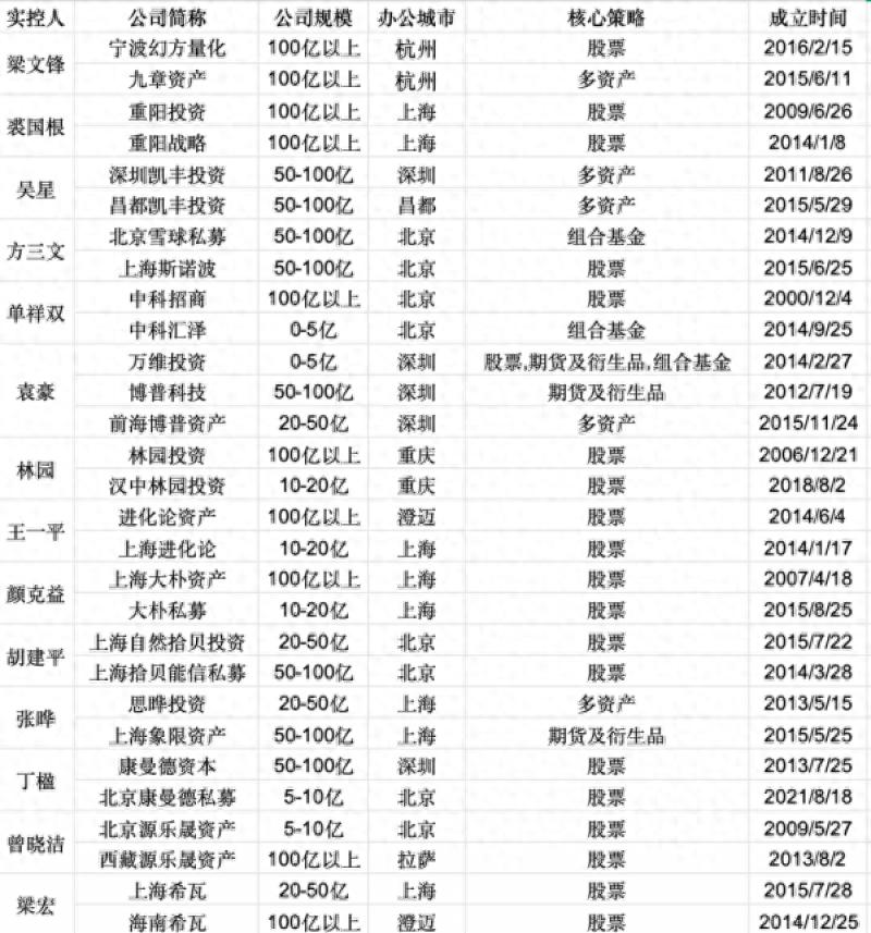 此外,值得注意的是,一方面,梁文锋、裘国根、林园等14位资本大佬“一人执掌多家私募”,另一方面,九坤投资、黑翼资产等10家机构采用“双实控人”模式。
